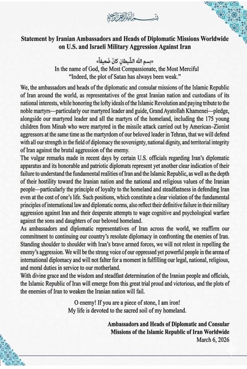 statement by Iranian Ambassadors and heads of Diplomatic Missions worldwide on the U.S. and Israeli military aggression against Iran